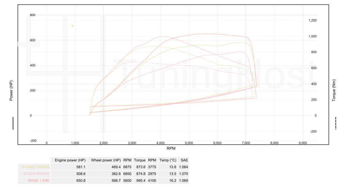 Diese Beschleunigungswerte werden mit E85 erreicht – das schöpft das volle Potenzial aus. Auf Normalbenzin (Super Plus) sind ca. 0,5 Sekunden langsamer zu erwarten, aber immer noch ein riesiger Sprung gegenüber Stock!